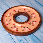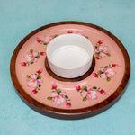 Bring your snacks to center stage with the thoughtful design of our handcrafted Sakura chip-and-dip platter made from acacia wood and paired with a ceramic dip bowl. Named after the iconic cherry blossom, Sakura captures the joy of blooming seasons and the beauty of togetherness. It features a round donut-shaped board with a recessed center for the bowl and a hand-painted enamel surface adorned with delicate floral motifs.