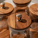Bring a refined touch to your table with Sheen, our set of four glass jars paired with acacia wood lids and sleek metal knobs, arranged on a solid wooden tray. Thoughtfully designed for both kitchen counters and dining tables, Sheen keeps everyday storage simple and neat.