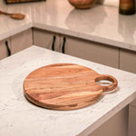 Bistrock brings the essence of nature into your kitchen, transforming the humble chopping board into something extraordinary. Handcrafted by skilled artisans, it showcases the beauty and durability of food-safe, cut-resistant Acacia wood, a material that outlasts plastic and bamboo alternatives. The round design combines practicality with elegance, making it perfect for chopping vegetables, or serving appetizers. The unique wood grain highlights the craftsmanship of each piece, turning this functional tool into a stylish centerpiece. This board offers a sustainable, long-lasting solution for your kitchen and serves as a handcrafted connection to nature. Elevate your kitchen with this timeless, functional work of art.