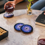 The Blue Nebula Coaster Set draws inspiration from the cosmos, where acacia wood meets vibrant enamel in a swirling celestial design, evoking a sense of cosmic wonder and depth.With their unique design, these coasters are perfect for everything from quiet morning coffees to lively dinner gatherings. They protect your surfaces while adding a touch of understated sophistication to your space. Each piece is carefully crafted, showcasing the rich texture of acacia wood and the intricate details, making every coaster a one-of-a-kind statement. Designed with sustainability in mind, it reflects a commitment to using eco-friendly materials without compromising on quality. Whether adorning a coffee table or office desk, these coasters serve as both practical tools and tasteful décor. Easy to maintain with a quick wipe, this Coaster Set combines natural artistry with modern utility, bringing effortless charm and practicality to your home.