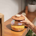 Add a touch of elegance to your kitchen with our handcrafted 'Halo' Canisters, made from premium hand-blown glass and topped with a beautifully crafted airtight acacia wood lid. The canister gets its name from the gentle halo effect created when light passes through its smooth, curved glass. Creating each canister is an intricate process where skilled artisans from Moradabad hand-blow molten glass with precision, ensuring a seamless and well-balanced form. Using time-honored techniques, they shape and refine the glass to achieve perfect clarity, symmetry, and a flawless finish that enhances both durability and elegance. The handcrafted acacia wood lid, accented with a resin knob for easy access, makes each canister one of a kind with its unique natural grain and finish, adding warmth and seamlessly blending functionality with natural beauty. Ideal for storing beans, rice, sugar, coffee, snacks, cereals, pickles, spices, and more, these stylish canisters are more than just a storage solution. They help you organize your kitchen, declutter pantry spaces, and enhance your home’s aesthetic. At Ireka Homes, we redefine thoughtful living by creating products that celebrate simplicity, sustainability, and the beauty of nature.