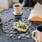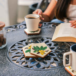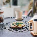 The Penta Bloom Coaster Set takes its name from the seamless fusion of acacia wood and vibrant enamel blooms, creating a stunning pentagon design that showcases the timeless beauty of blooming yellow flowers. With their unique design, these coasters are perfect for everything from quiet morning coffees to lively dinner gatherings. They protect your surfaces while adding a touch of understated sophistication to your space. Each piece is carefully crafted, showcasing the rich texture of acacia wood and the intricate details, making every coaster a one-of-a-kind statement. Designed with sustainability in mind, it reflects a commitment to using eco-friendly materials without compromising on quality. Whether adorning a coffee table or office desk, these coasters serve as both practical tools and tasteful décor. Easy to maintain with a quick wipe, this Coaster Set combines natural artistry with modern utility, bringing effortless charm and practicality to your home.