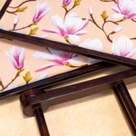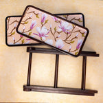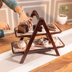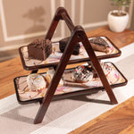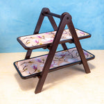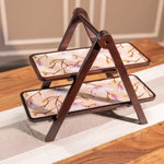 Handcrafted by skilled artisans from Moradabad, Sakura combines acacia wood with printed enamel trays featuring soft, nature-inspired floral artwork. The sturdy A-frame design holds two removable trays, ideal for serving snacks, desserts, or organizing your dining or bar setup with effortless style.