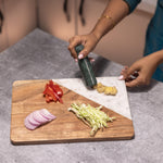 Handcrafted by skilled artisans from Moradabad, it features food-safe, cut-resistant acacia wood paired with a strong slab of natural marble. The wooden part is great for chopping, while the marble side can be used to crush spices or serve cold items.