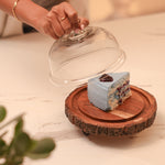 Each piece is handmade by skilled artisans from Moradabad, with a natural wood slice base that showcases the bark edge for an organic, earthy appeal. The hand-blown glass dome keeps your cookies, truffles, or mini bakes fresh while offering a clear view of your display. The unique grain and raw bark texture make every piece one of a kind.
